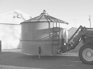 He made 12-ft. extensions to slide over the existing tines on his pallet fork to pick up the bin. Gutschmidt runs a chain all the way around the outside of the bin to keep it from falling off while he carries it into his shop.
