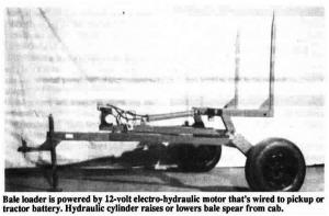 It's powered by a 12-volt electro-hydraulic motor that's wired to the pickup battery. A hydraulic cylinder raises or lowers the bale spear from the cab. By pulling a pin, the bale spear can be mounted on a pickup bed. By pulling three pins you can 3-pt. mount the bale spear on a tractor.