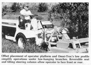 Its 43 in. height, plus a wide (62 in.) drive wheel tread, give the Omni-Trac exceptional stability for safe use with high-lift attachments, such as pruning towers. The combination of a full-pivot caster wheel and independent hydrostatic steering to each drive wheel permits a turning radius of only 8 1/2 ft. Convenient direction-reversing controls, either hand or foot operated, enable the operator to maneuver the Omni-Trac while simultaneously operating a forklift or other attachment.