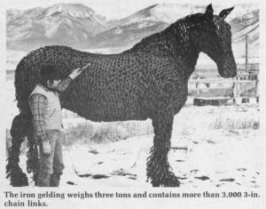 Made by welding the chain links together, the gelding weighs 6,000 lbs. and contains over 3,000 3-in. links salvaged from a cement plant kiln. It has a minimal inner framework of steel rod, but is basically hollow.