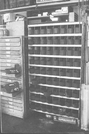 Storage System For Nuts And Bolts FARM SHOP Miscellaneous 32-6-36 Mark Snider, Cle Elum, Wash.: "My storage system for nuts and bolts was simple to make from scrap wood and old oil jugs. There are 72 separate compartments, each with a slide-out jug (cut down as shown at left in photo). Each compartment is 8 1/2 in. deep and 7 in. high. There are 1/8-in. saw cuts every 5 in. Pieces of 1/8-in. plywood are inserted into the cuts for vertical dividers. Narrow 1 1/2 by 3/4-in. strips of wood nail to the front of each shelf as stiffeners and to keep the jugs from sliding out too far. The wood strips are nailed to each shelf, positioned so they're even with the shelf above and extend down into the compartment below. When you pull the jug out it hits the stop, but you can tip it up to take it out."