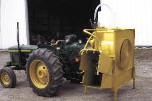 He used a big 28-in. dia. squirrel cage fan, pulleys and shafts from an old pull-type sprayer. The tractor pto belt drives both the fan and a spray pump.