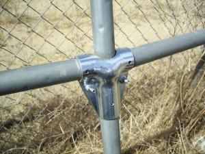 The pole clamp has a figure-8 twist that allows the connection of vertical and horizontal pipes. The versatile T-clamp offers an alternative to repair broken pipes as well as a variety of other uses such as adding pipes to the top of the corral for extra reinforcement.