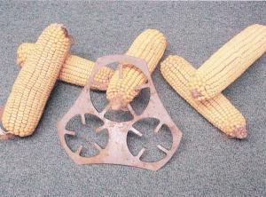 His corn sheller is made from 3/16-in. thick steel plate with three holes stamped out of it. Five -in. long spokes extend into each hole like the spokes on a wheel. The sheller is placed over a container to catch the corn.
