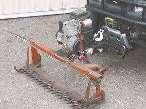 Front-Mount Sicklebar Mower MOWERS Mowers (31H) 90-10-14 An old walk-behind sickle mower purchased for $20 was modified for use with the front hitch by Kyle Sand, Avon, Minn. A 1/2 hp Briggs and Stratton motor with a 1 to 6 reduction gearbox provides the power. It's mounted on a length of 8-in. channel iron that fits the receiver hitch so the winch can lift and lower the mower.