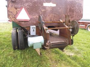 "I built it because I needed more grain hauling capacity, but couldn't justify the cost of another grain trailer or tie up another tractor. The potato wagon on back unloads via a chain-type conveyor. I geared down the conveyor's speed so that both wagons unload at about the same speed. As a result, I can unload both wagons into a bin auger without having to move twice."