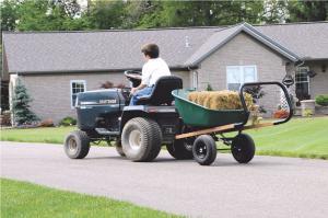 An optional quick-hitch attachment is available that hooks to the front wheel axle, converting the wheelbarrow to a trailer that can be pulled behind a garden tractor or ATV.
