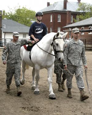"It has many of the same benefits as riding. They are just riding on a flat surface as opposed to a horse," Pence says, whose Washington, D.C.-based group is called Caisson Platoon Equine-Assisted Program, or CPEAP (www.operationsilverspurs.org/CPEAP.html). Members of the famed Old Guard Caisson platoon, who drive flag-draped caissons to Arlington Cemetery, are assigned to work with wounded soldiers. The program has become an approved therapy option by the Veteran's Administration and wounded vets come mainly from Walter Reed Medical Center.