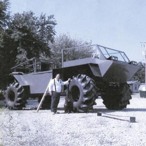The 4 wheels are powered by differentials from 10-ton Mack trucks. The rice tires are 30.5 in. wide. A hydrostatic drive operates the propeller using the pump from a concrete mixer.