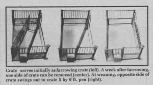 Initially, it serves as a farrowing crate. Then, a week or so after farrowing, one side of the crate can be swung out to give the sow more room to move around, yet provide a corner creep for the pigs. At weaning, the opposite side of the crate swings out to create an open 5 ft. by 9 ft. pen (also available 5 by 8).