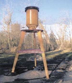The feeder’s legs are about 4 ft. long and are made from treated lumber. “I install a large plywood shelf about halfway up the legs. In summer I place a plastic 5-gal. pail of water on it, and in the winter I add suet,” says Gruber. “I use 2 by 6’s to make the legs and shave them down to 2 in. wide at the bottom so the feeder isn’t as heavy. It’s light enough that I can easily move it by hand when I mow my lawn.”