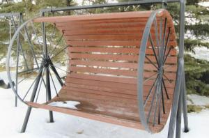 He simply bolted 2 by 4’s to the inside of the wheels to form the curved seat and back. The wheels are attached to metal brackets that pivot on a big steel frame supported by A-frame legs made from 2 3/8-in. dia. oilfield tubing.