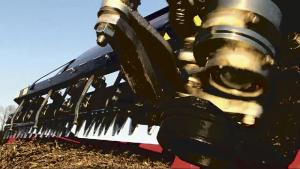 “The slicer operates like an old fashioned sickle bar without the fingers,” Blank says. “Two sickle bars are mounted together with a cam drive moving the sickles in opposite directions, creating a slicing action. A small hydraulic motor that gets its hydraulic power from a 13 hp gas engine drives the cam. Increasing or decreasing the hydraulic flow to the motor changes the sickle speed.