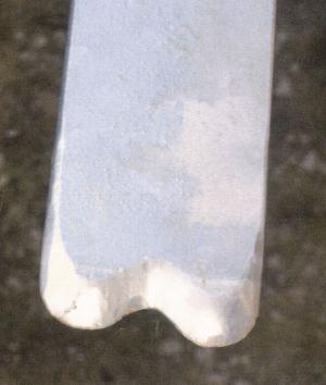It consists of a 9-in. curved metal blade, made from a light truck or car leaf spring, welded to a 1-in. dia. pipe handle. The back side of the blade edge is sharpened. You push down on an angle iron footrest to shove the blade into the ground next to the thistle.