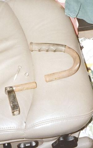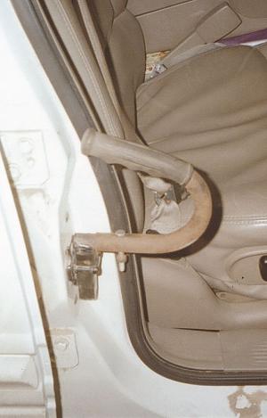 I came up with this hand hold to make it easier for my wife get in and out of our 1992 and 2001 Buick cars. It consists of a used, curved handle from an old push-type lawn mower. The handle slides over a short metal rod with a hole drilled into it and is secured with a 1/4-in. bolt. The rod is welded to a square tubular piece that fits snugly into a latch on the car’s door post. It’s easy to install and remove. The same idea would probably also work in other GM cars equipped with the same door latch system. (Donald L. Horacek, 1840 31st Rd., Brainard, Neb. 68626 ph 402 545-2238)