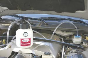 Romani advises checking fluid first to ensure it’s not excessively dirty, as pushing the impurities through may damage or plug lines. If the fluid is dirty, siphon out available fluid instead, and refill with clean fluid before pressurizing and continuing the process.