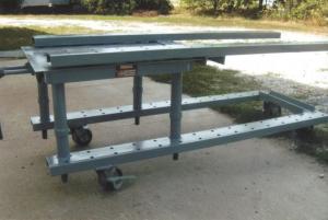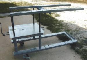 Goodwin’s hoist is a simple apparatus that he made from a heavy-duty work table that a friend gave him. He mounted the table on a sturdy 2 by 5-ft. metal frame made of 4-in. channel iron. He added 500-lb. caster wheels with brakes on the frame’s corners so it became an easy-to-maneuver dolly. Then he made an identical channel iron frame that mounted to threaded shafts on top of the table.