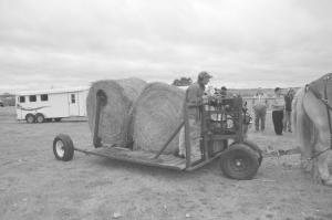 Sams and his son, Matthew, use horses with a wheeled cart built out of scrap parts to haul big round bales to their beef herd. An 8 hp gas motor controls hydraulic arms similar to a tractor bale unroller to load and unload up to three big round bales at a time. A fifth-wheel style hitch at the front, allows the cart to make tight turns.