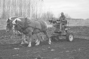 Sams buys used equipment at local auctions and from retiring horse owners, but notes new equipment is still being made for horses. For example, he has a power cart made my Pioneer that has an engine, pto, hydraulics, and everything needed to hook up any implement. Horses can be used for all types of tillage including minimum and no-till. The width of the implements and aggressiveness of the tillage determine how many horses are needed to pull the equipment.