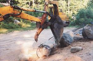 “It’s a mechanical clamp that mounts on a backhoe, replacing some of the linkage and pins,” says Lund. “The Hoe Clamp moves as the bucket moves. It can be pinned in 2 different locations, depending on the type of work you’re doing. I usually use it in a position where I can still dig. It’s extremely useful in building rock walls, and is easier to use than a hydraulic thumb. The company builds these units to specifically fit your backhoe.”