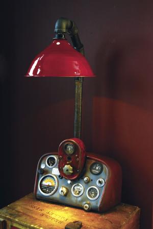 Carling also makes lamps adorned with old-time steam gauges. “I bought a bunch of gauges and parts off old steam tractors and figured out a way to put them together,” he says. “I also use the steam gauges off old pressure cookers and ones used on sprinkler control valves from old buildings and factories. Some of the gauges are so beautiful that I find it hard to part with them.”