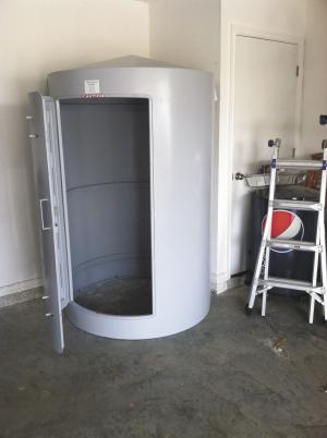 Being round and above ground has several advantages, Bundy says. Many people, especially older people, don’t like to go into underground shelters. By placing it in a garage, it’s easily accessible. If it’s buried in debris from a tornado, people inside can bang on the metal to be heard by rescuers – or use a cell phone. There are two small, covered vents and air coming in from around the door to provide adequate ventilation.