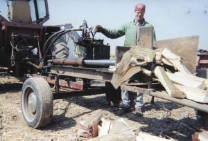 The split wood falls onto a wood chute made out of steel pipes. The splinters and debris fall through, and helpers remove the split wood. Each year, the Zemlicka family splits wood to supplement heating fuel for three or four homes.