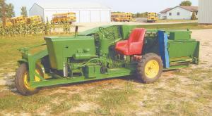 Power comes from a 4-cylinder engine that once ran a self-propelled Deere swather. The engine mounts directly to the frame and is covered with custom-formed sheet metal. To the casual observer it looks almost like a small, factory-built tractor with a mounted picker. The engine shaft goes through a 4:1 belt reduction assembly before mating with a 4-speed transmission from an old Chevy truck. “First gear gives me an operating speed about as fast as a person can walk,” says Don, “and 4th gear has a top speed of about 15 mph. Braking is done with the original hand-operated emergency brake.” The transmission also produces 540 rpm power that runs the picker.