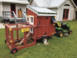 Since he only keeps 4 to 5 chickens at a time, he started with a small, 4 by 4-ft. Harbor Freight trailer, which pulls easily behind his lawn tractor. He built a 2 by 4-frame coop onto the trailer frame. It’s insulated with foil-faced foam board insulation and has a metal roof.