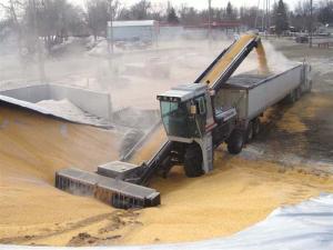 Biggest Grain Moving System We’ve Ever Seen GRAIN HANDLING Miscellaneous We talked to the manufacturer of this big grain moving system at the recent Nebraska Power Farming Show The Swift “Gobbler” mounts on a Uni Harvester and is designed to unload big grain piles at high speed into semi trucks It’s used mostly by big grain elevators and terminals The “Gobbler” has its own self-contained hydraulic system that’s belt-driven off the UniHarvester It features a 12-ft wide detachable auger header that rides on big steel caster wheels and a 50-ft long by 3-ft wide high speed conveyor belt equipped with a hydraulic-controlled rotating chute All operations are hydraulically controlled from the Uni Harvester cab The truck driver simply backs in under the conveyor and uses a CB radio to communicate with the UniHarvester operator The auger header rides on heavy duty caster wheels and delivers the grain to four 2-ft wide rubber-covered paddles at the center that rotate like a paddleboat A 4-ft long by 2 1/2-ft wide accelerator located behind the header contains a second set of paddles and delivers grain onto the belt A hydraulically-raised “fence” on front of the header is designed to protect aeration tubes inside the pile and there’s a clod buster behind the auger header “We have several of these units in use across the U S ” says Doug Buchanan Swift Mfg Co Clara City Minn “Some of the grain piles contain 2 million bu or more Sometimes if the elevator’s wet bin can’t keep up at harvest they’ll stack the grain outside and later load it into semis and dry it again “The Gobbler can move 20 000 bu /hr and load a 1 000-bu semi truck in just over 3 min It can move grain twice as fast as 2 wheel loaders but uses only half as much fuel and requires only one operator The conveyor and header auger bolt together and can be loaded on a double drop deck trailer for transport ” Contact: FARM SHOW Followup Swift Mfg Co 8015 Hwy 7 S E Clara City Minn 56222 ph 800 354-2106; swiftdougb@hcinet net; www swiftmfg com