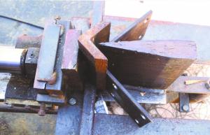 Each V-shaped piece is welded to a 1-in. thick steel plate that rests against the splitter’s push plate. The welded-together blocks are held in place on both sides by a pair of big set screws. To convert back to splitting wood, Robinson loosens the set screws and then pulls the press brake off the push plate.