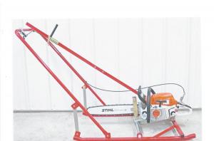To use, a chain saw is locked in place with the remote throttle connection attached. Once the chain saw has been started, the operator can adjust the throttle and the pitch of the bar from the U-bar handle of the powder coated frame. Slush and ice chips are kicked ahead and away from the operator.