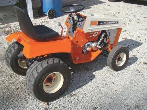ATV-Garden Tractor Goes 50 Mph ATV S “When you meet a car on the road and are going 50 mph on a garden tractor you get some really weird looks ” says Mike Crutcher who built an “ATV garden tractor” by combining a 1972 Allis Chalmers 410 garden tractor with a 1993 Kawasaki Bayou 220 ATV The machine’s frame engine transmission suspension system rear wheels rear end and brakes are all from the ATV The seat steering box and body are from the tractor “It’s pretty much a Kawasaki ATV inside a tractor body I modified the 4-wheeler components to fit the tractor ” says Crutcher “Fitting the engine in was a big job I measured the tractor’s wheelbase then cut the ATV frame in half and lengthened it to fit the tractor’s body I also had to cut the sides out of the tractor body in order to make room for the engine “The gauges on the dash are only for looks I have right around 600 hrs of labor in it I built it because I wanted to do something different and just use it to run around town ” The 220 cc ATV engine has a 5-speed transmission with reverse which is operated by a Hurst car shifter located on one side of the operator platform The shifter is connected by a long metal rod to the transmission’s shift linkage The rear ATV wheels are fitted with sport racing dirt tires The front wheels and tires were designed for a small trailer Crutcher modified them to fit the ATV’s wheel hubs He made the brake pedal and throttle in his shop “It was a lot of work but I enjoyed doing it ” says Crutcher You can watch a a video of the machine by going on youtube and typing in “rabbid allis” “My thanks to Mike and Ace Adams for making the video ” says Crutcher Contact: FARM SHOW Followup Mike Crutcher 102 Magnolia Lane Cooksville Ill 61730 ph 309 838-3542; macmm55@gmail com