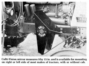 Retail cost of Culti-Vision, which comes painted black for good compatibility with all tractor colors, is $75. Individual mirrors are equipped with a short "row guide" steel rod that serves as a steering marker for the driver and can be mounted on top the mirror, or below.