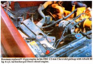 Chevy pickup repowered with Deere diesel engine ENERGY Miscellaneous 17-3-24 "It gets 25 mpg and will last as long as the pickup," says Merrit Bowman, Clearville, Penn., who, with the help of his son Allen, replaced the V-8 gas engine in his 1981 1/2ton Chevrolet pickup with a rebuilt 80 hp 4cyl. turbocharged Deere diesel engine.