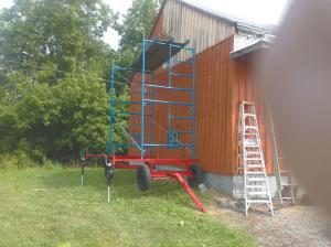 Wagon-Mounted Mobile Scaffold BUILDINGS Miscellaneous Ian MacCuaig and his son James of St Telesphore Quebec mounted a commercial scaffold on the running gear off an old 3-ton hay wagon converting it into a mobile scaffold Four leveling jacks at the bottom of the scaffold can be telescoped in or out from either side to keep the scaffold level on uneven ground The scaffold came in 2 halves but the bottom half is now welded permanently to metal brackets that bolt onto uprights on the wagon axles The jacks are welded to telescoping pipes made from 2 and 1 3/4-in sq tubing with the scaffold welded to them “We built it last summer and used it to nail boards and battens onto a large shed and then stain it It worked great ” says MacCuaig “We already had the scaffold but we got tired of having to take it apart every time we had to move it Now we can just hitch the scaffold to our tractor or ATV and move it around the building as we work Two people can also easily move it around by hand ” If the ground is uneven the men can telescope the jacks in or out and then crank them until the scaffold is level They can also keep adding more sections on top of the scaffold as needed “The only time we’ll probably have to remove the top half of the scaffold is when we put it inside a building for the winter ” says Ian “We already had most of the materials so our cost was next to nothing The wagon running gear is from the early 1950’s and had been sitting behind our barn for years We cleaned and painted it to make it look nice ” Contact: FARM SHOW Followup Ian MacCuaig 1960 Ch du Grand Patrice St St Telesphore Quebec Canada J0P 1G0 ph 450 764-3464; ian@maccuaig ca