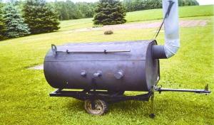 Smoke goes out a chimney that’s welded into a hole he cut into the other end of the barrel. It keeps rain out of the barrel and ashes in. There’s also a small vent at the bottom of the barrel with a screen over it. To clean out the ashes, Fetting removes the screen and then uses a homemade clean-out tool - that mounts on the side of the tank - to pull ashes out through the vent.