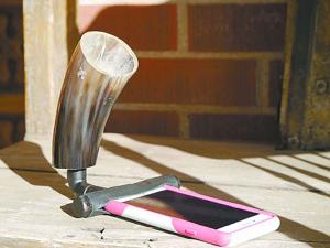 Cow Horn “Speaker” For iPhones FARM HOME Miscellaneous Inventor Frank Falk takes cow horns and other antique items including including phonographs and gramophones and turns them into amplifiers for cell phones He says iHorns can be used with any portable device with an external speaker located at the bottom of the device The iHorns are not Bluetooth or Wi-Fi connected but are simply a passive amplifier he says No batteries cords or cables are needed You can see a few examples of Frank’s iHorns on Facebook and at his website Contact him via email at ihorns4u@gmail com or go to “iHorns” on Facebook His website is: www ihorn weebly com