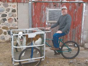 “I was in Mexico on vacation, and saw workers with cargo boxes on front of their bikes. I like to build things, so when I got back home, I made one,” Tim Zelenski explains about where he got the idea for what he calls “The Rover” that he often rides between his place and his father’s farm. His St. Bernard, Macy, often rides inside.