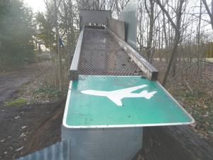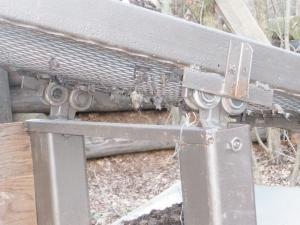The screen is slotted, expanded mesh with an overlay of “rat wire” (hardware cloth). Stremlo added the hardware cloth to reduce the hole size and resulting particle size. The screen frame rides on plastic wheels that are mounted to uprights on the main frame.