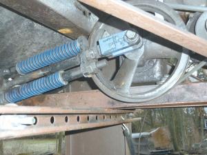 The connecting arm is a set of shock absorber type springs from an old conveyer dishwasher. “One spring in the pair regulates how hard it pushes the screen downhill, and the other regulates how hard it pulls the screen back up the slope,” says Stremlo. “When the screen slides downhill, the engine has to work hard pulling it back up. The spring reduces that effort.”