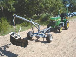 Texas farmer Glenn Thompson, of Fredericksburg, recently converted an old 3-pt. mounted crane to a 2-wheeled model that hooks up to a ball hitch mounted on front or back of his Deere compact tractor. He uses it to move garden tractors and the implements that go with them around on his farm.