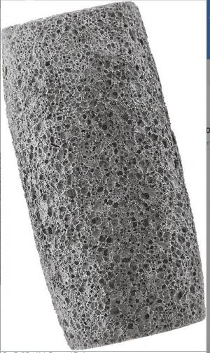 Fur-Zoff is made by grinding recycled beer and wine bottles into a fine powder, then mixing the powder with a binding agent. The mixture is sent through an extruder, emerging as pliable 6-in. long oblong plugs. The plugs are then baked at 1,550 degrees F. The glass melts and the bonding agent produces a gas, which forms the bubbles that create the rough texture of the Fur-Zoff block.