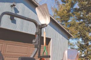 The rifle and tool holder is made mostly from steel tubing and flat steel. It clamps onto one side of the ROPS with 4 bolts. The tool is held in place by plastic ratchet-type clamps similar to ones that bolt onto an ATV rack. The base is a length of tubing with a slot cut into it. “The combination of the ratchet-type clamp and the slot in the base keeps everything secure. I’ve plowed and disked with tools in the holder but never had anything bounce out,” says Lundstrom.