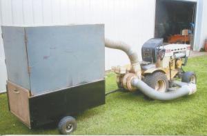 “It has more capacity than most pull-behind lawn vacs,” says Bewley. “The vacuum blower came off some kind of old leaf chopper. I found it setting on a skid with the engine and blower all built together as one piece. I got the flexible hose from the Cummins Engine company where I worked for 30 years. It had been used as the air intake pipe for a test block where the company tested their diesel engines.”