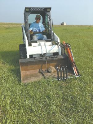 Barry Anderson’s skid steer attachment picks up individual large rocks, loads them into the bucket and when the bucket is full, piles them as high as the loader can go. Best of all, it requires no bucket or loader modifications.