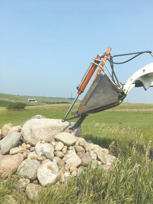 Skid Steer Picks Packs And Piles Rocks ROCK PICKERS Barry Anderson’s skid steer attachment picks up individual large rocks loads them into the bucket and when the bucket is full piles them as high as the loader can go Best of all it requires no bucket or loader modifications “I didn’t want to drill holes or make other modifications to the bucket like other pickers on the market ” says Anderson “I also wanted to be able to dump rocks in a pile Other smaller pull-behind pickers seem to have trouble dumping in piles more than 2 ft high ” Nearly 70 Anderson credits a bad back with forcing him to think about alternatives to picking rocks by hand “I had work done to fuse vertebrae and picking rocks had become difficult ” he says “Sometimes I could only do it for an hour or so ” Anderson figured his old skid steer was the answer He just needed to figure out how to roll rocks into the bucket When he replaced a garage door opener he salvaged the rail cutting it into teeth for a rock fork To keep the rocks from rolling off Anderson cut off the last 25 percent or so of the teeth and welded them back on at an angle Angle iron from an old bed frame was repurposed for the picker frame In order to bolt it to the bucket Anderson removed the hardened bucket edge to expose pre-drilled holes He bolted the picker teeth to a short length of steel pipe using U-bolts and mounted the pipe to the angle iron frame that extended out past the edge of the bucket The pipe rotates in place with the help of a hydraulic cylinder The cylinder mounts to a piece of square tubing that is bolted to the picker frame and extends over the rear of the bucket The ram’s clevis pins to a steel arm fixed to the pipe “When I extend the cylinder the teeth extend down into the dirt under a rock and when I retract it the teeth rotate back to drop the rock in the bucket ” says Anderson “When the bucket is full I can drive to a rock pile raise the arms and dump ” Anderson notes that getting the hydraulic hose lengths right was one of his biggest challenges He used steel pipe for a rigid set of connections from the cylinder to near the bottom of the bucket This considerably reduced the length of hoses needed “It took 3 or 4 tries to get the lengths right but now it works fine ” he says “I can sit in the skid steer and pick rocks much longer than I could by hand ” Contact: FARM SHOW Followup Barry Anderson 170 Skyline Dr Granite Falls Minn 56241 ph 320 564-4500 or 507 828-0613; bkanderson1@mchsi com