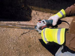 Markman’s bucket had the standard beveled edge. He gave it a knife’s edge, working his handheld grinder along the top of the bucket’s cutting edge. At the same time he sharpened the outside corners of the bucket.