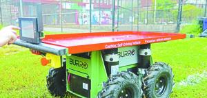The current design is a 26-in. high, 2-WD, 26 by 48-in. chassis that can carry 300 lbs. The 4-WD option can carry 450 lbs. With a top speed of 5 mph, its 2 lead-acid batteries give it a range of about 4 hrs. or 15 to 20 miles.