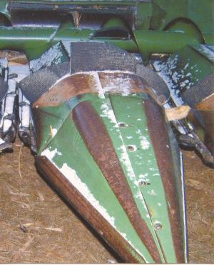 Smith uses the idea on his Deere 6600 4-row combine. He started with some 12-in. wide conveyor belting from an old iron mining operation that a friend gave him. He used a utility knife to cut the belting into sections about 1 ft. long by 5 in. wide, then bolted 3 sections side by side about halfway down each snout using existing holes.